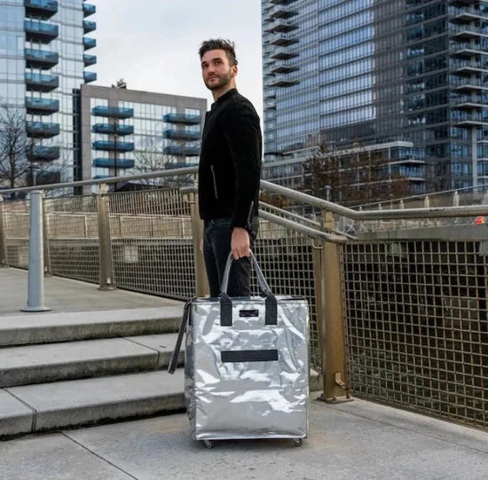 The Medium and Large HK Rolling Totes are ideal for transporting items through the airport, but they’ll need to be emptied and folded to fit under a seat or in an overhead bin, as they typically exceed standard carry-on dimensions.